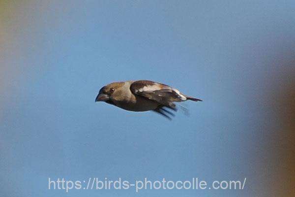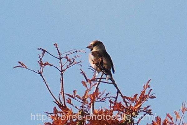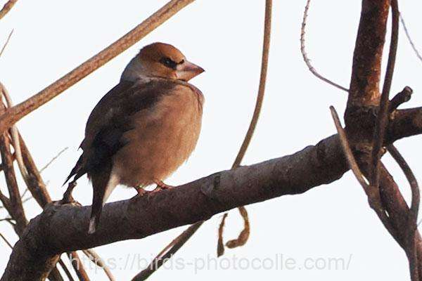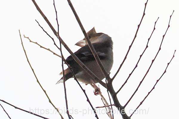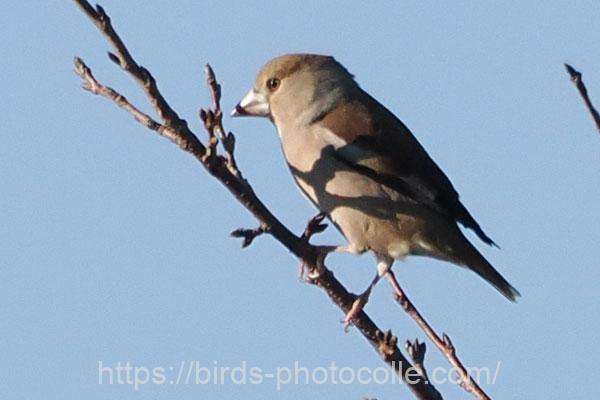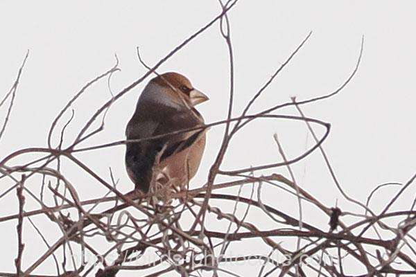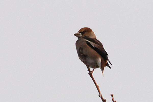 勅使池のシメ(スズメ目アトリ科):結構イカツイ顔ですね、強そうな嘴とやや頭でっかち?で尾が短い。アトリ、カワラヒワの仲間です。サントリーの愛鳥活動「シメ」