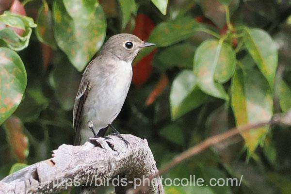 コサメビタキ(スズメ目ヒタキ科サメビタキ属):大きな目が特徴的で、目の周りにはっきりとした白いアイリングがあります。嘴は黒く、下嘴の根元部分はオレンジ色をしています