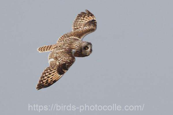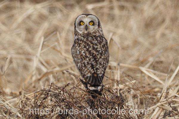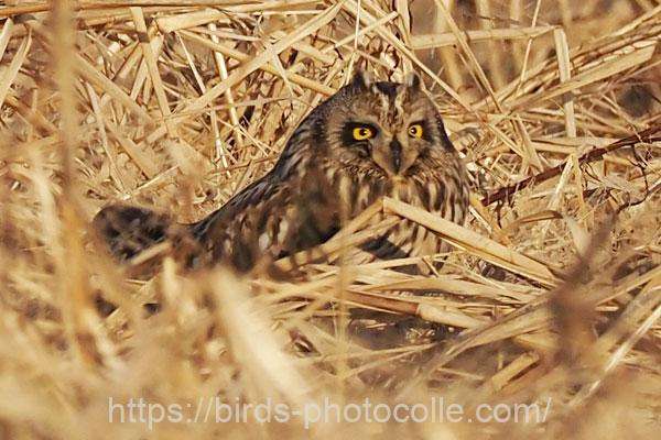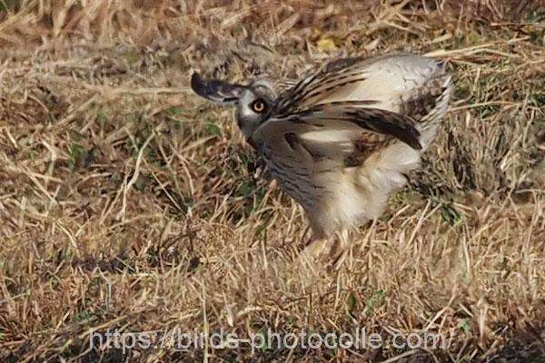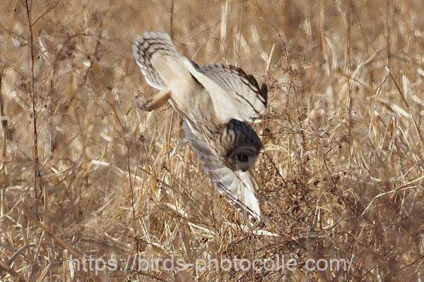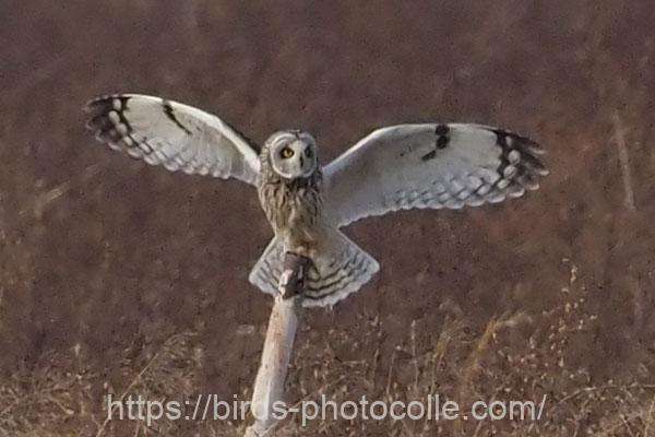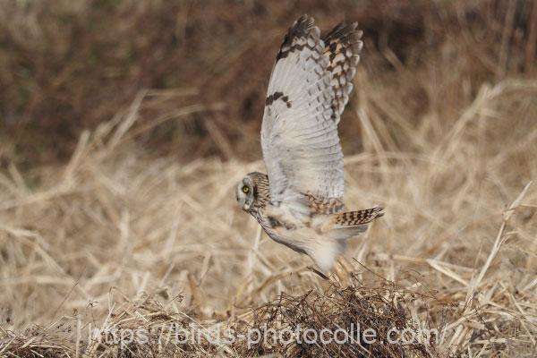 コミミズク(フクロウ目フクロウ科)夜行性のようですが、撮影場所では夕方に多く観察されています。好物は野ネズミ