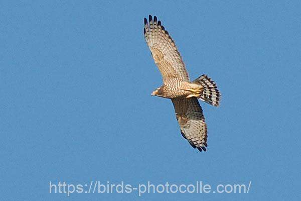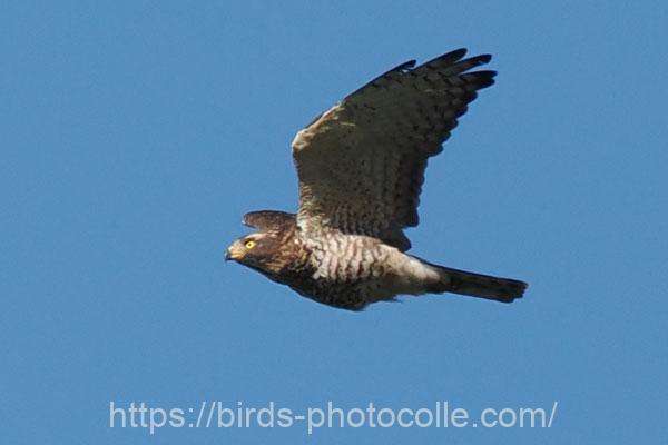 サシバ(タカ目タカ科サシバ属):背面は赤褐色で、腹側には茶褐色の横縞があり、喉に黒い線が1本あり翼指は5本です。東北地方以南に夏鳥として渡来し、繁殖します。冬は南西諸島からフィリピンやインドネシアなどの東南アジアで越冬します