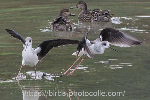 勅使池の野鳥 セイタカシギ(チドリ目-セイタカシギ科)翼は黒または灰色、首筋から腹部にかけては白色で、赤またはピンク色の長い足が特徴