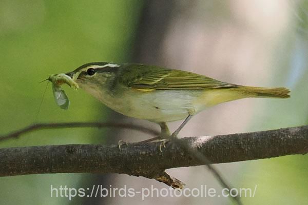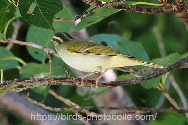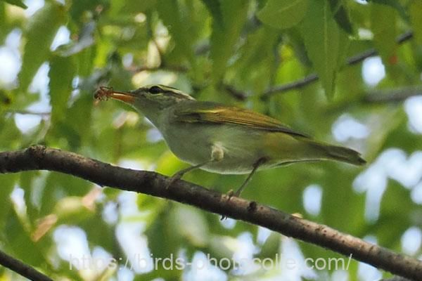 センダイムシクイ(スズメ目-ムシクイ科):上面は緑がかったオリーブ色で、腹部は白っぽく、黄色みがかった部分もあります。目の上にある白っぽい眉斑(びはん)と、頭の中央にある淡い灰色の頭央線(とうおうせん)が特徴ですが、見え方に個体差があります。下嘴がオレンジ色。