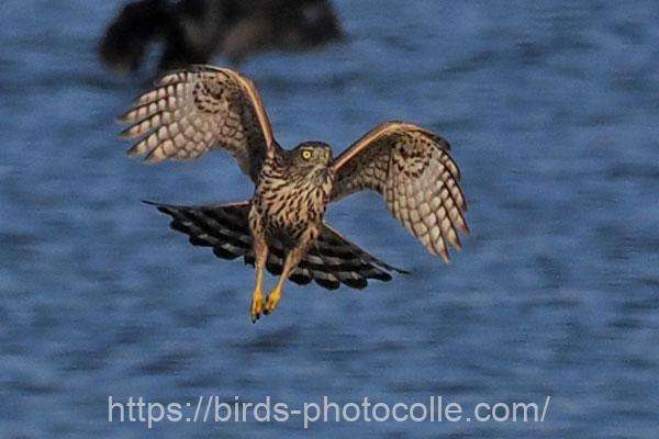 勅使池のオオタカ(タカ目タカ科)オオタカ画像第7集:成鳥の腹は白に細い黒の横斑、幼鳥は薄茶に濃茶の縦斑がある。雌は雄より少し大きい
