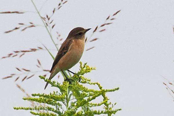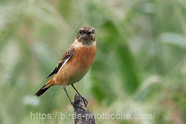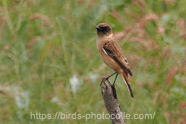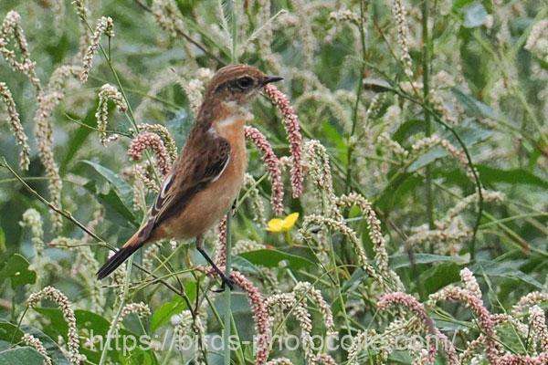 ノビタキ(スズメ目ツグミ科)ノビタキは日本に夏鳥として飛来し、北海道の草原や本州中部の高原地帯などで繁殖します。渡りの時期である春と秋には、平地の農耕地や河川敷などでも見かけることがあります