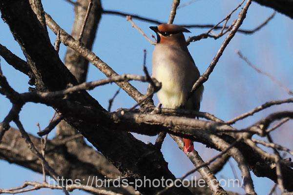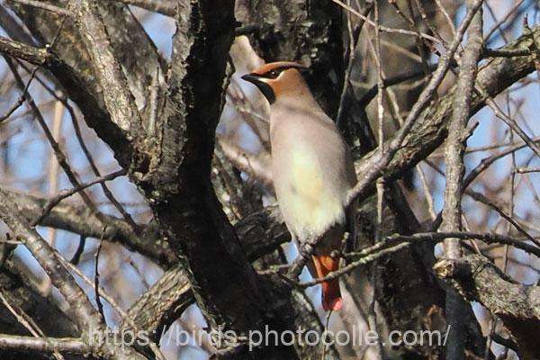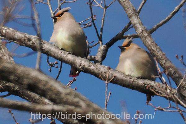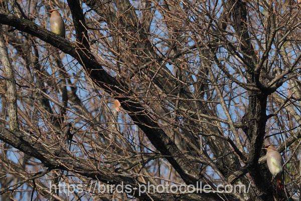 ヒレンジャク(スズメ目レンジャク科):群れをなすがキレンジャクが混在する事もある。冠羽があり尾の先端は赤っぽい。