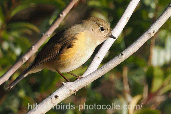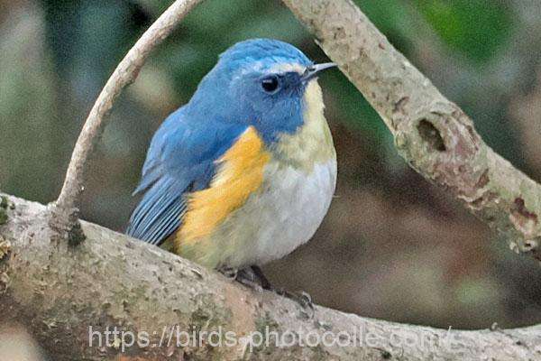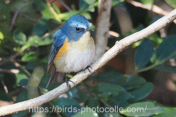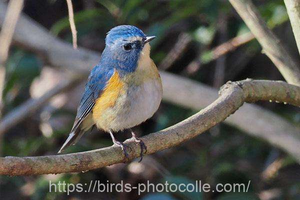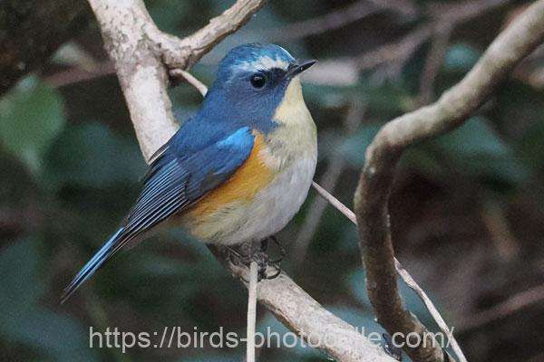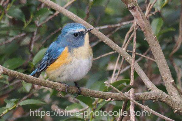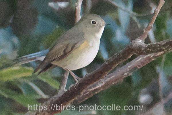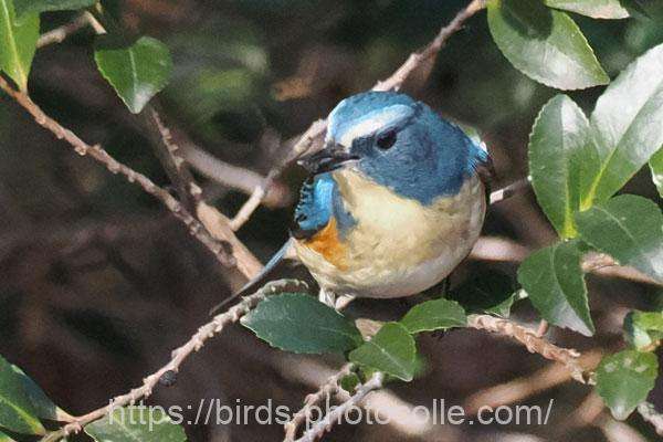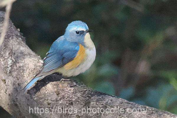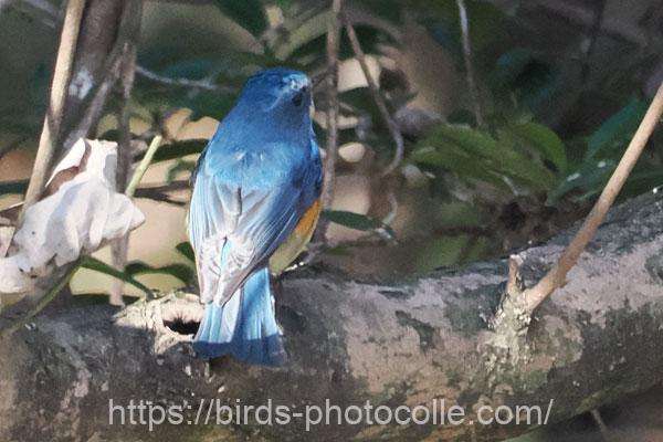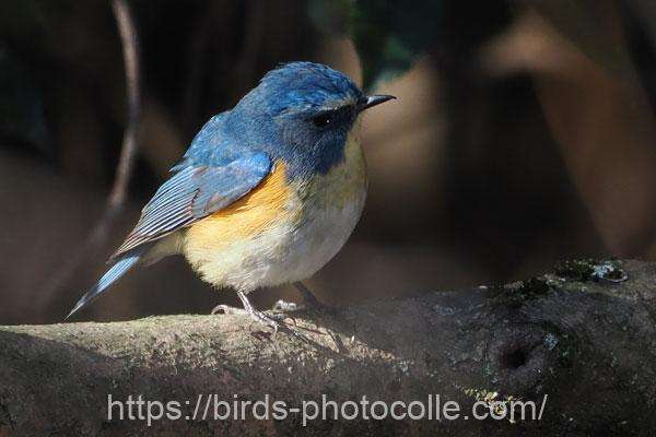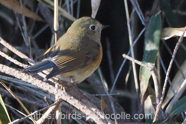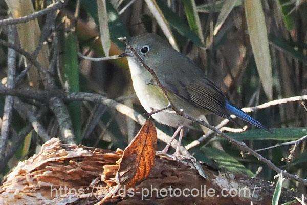 勅使池のルリビタキ(スズメ目ヒタキ科):♂は顔から上面にかけては青色が特徴。♀は顔から上面はオリーブ褐色で尾は青、脇腹は橙黄色。